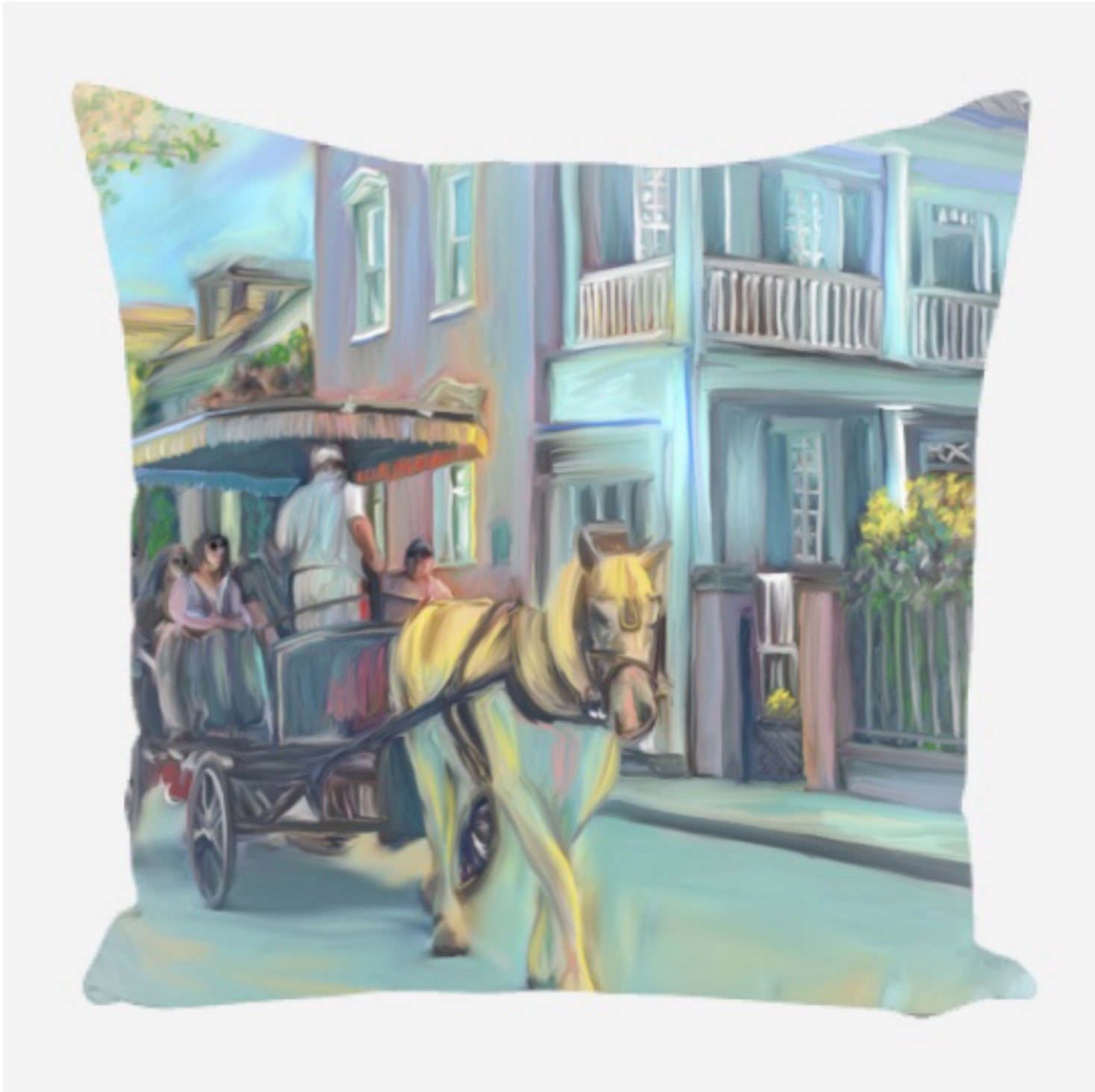 Double sided canvas pillow with beautiful design of horse carriage in Charleston SC from my original painting. Great memory from your trip 🐴!